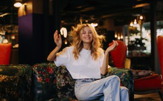 A curly haired woman smiles outside YOTELPAD London Stratford's exterior