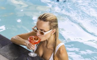 A woman swimming to the side of the pool, and sips on a red cocktail.